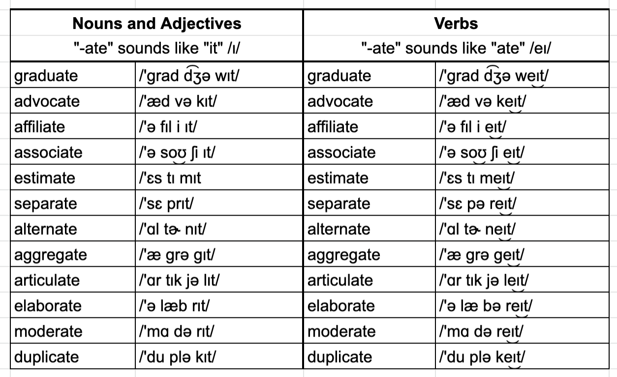 So now we have the same spelling and word stress for some nouns, adjectives, and verbs, but the pronunciation changes for the “-ate” suffix. The part of speech of the word will determine which sound it is: